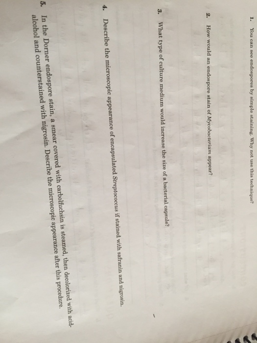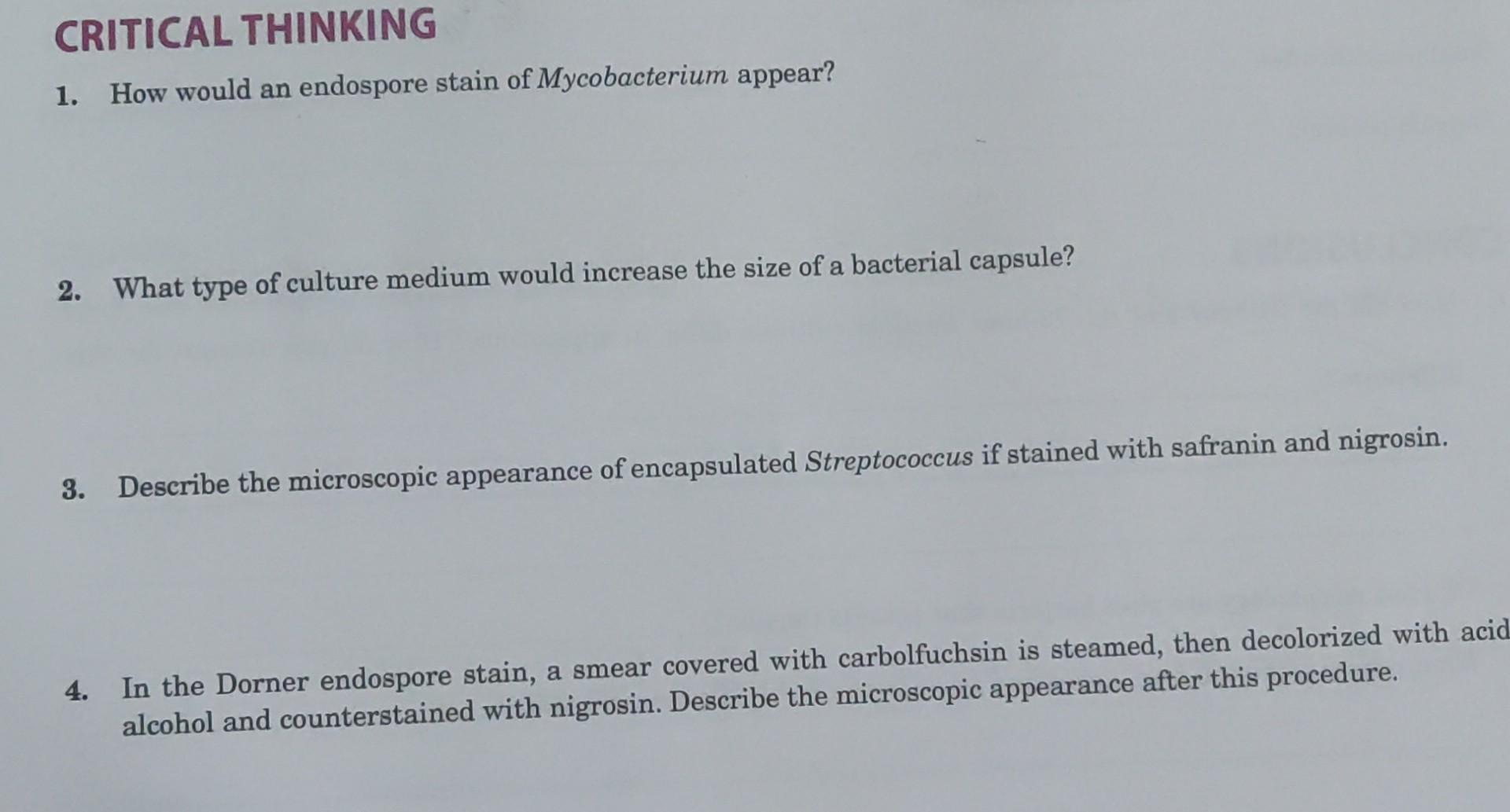 Solved Critical Thinking How Would An Endospore Stain Of Mycobacterium Appear What Type Of Culture Medium Would Increase The Size Of A Bacterial Capsule Describe The Microscopic Appearance Of Encapsulated Streptococcus If Stained